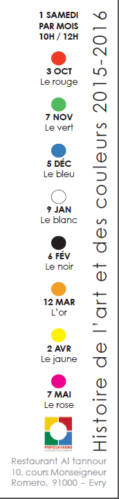 – Premier cours d’Histoire de l’Art par la Couleur le samedi 3 octobre 2015 au restaurant Al Tannour d’Evry : « Le rouge » par Audrey Moutardier, historienne de l’art.