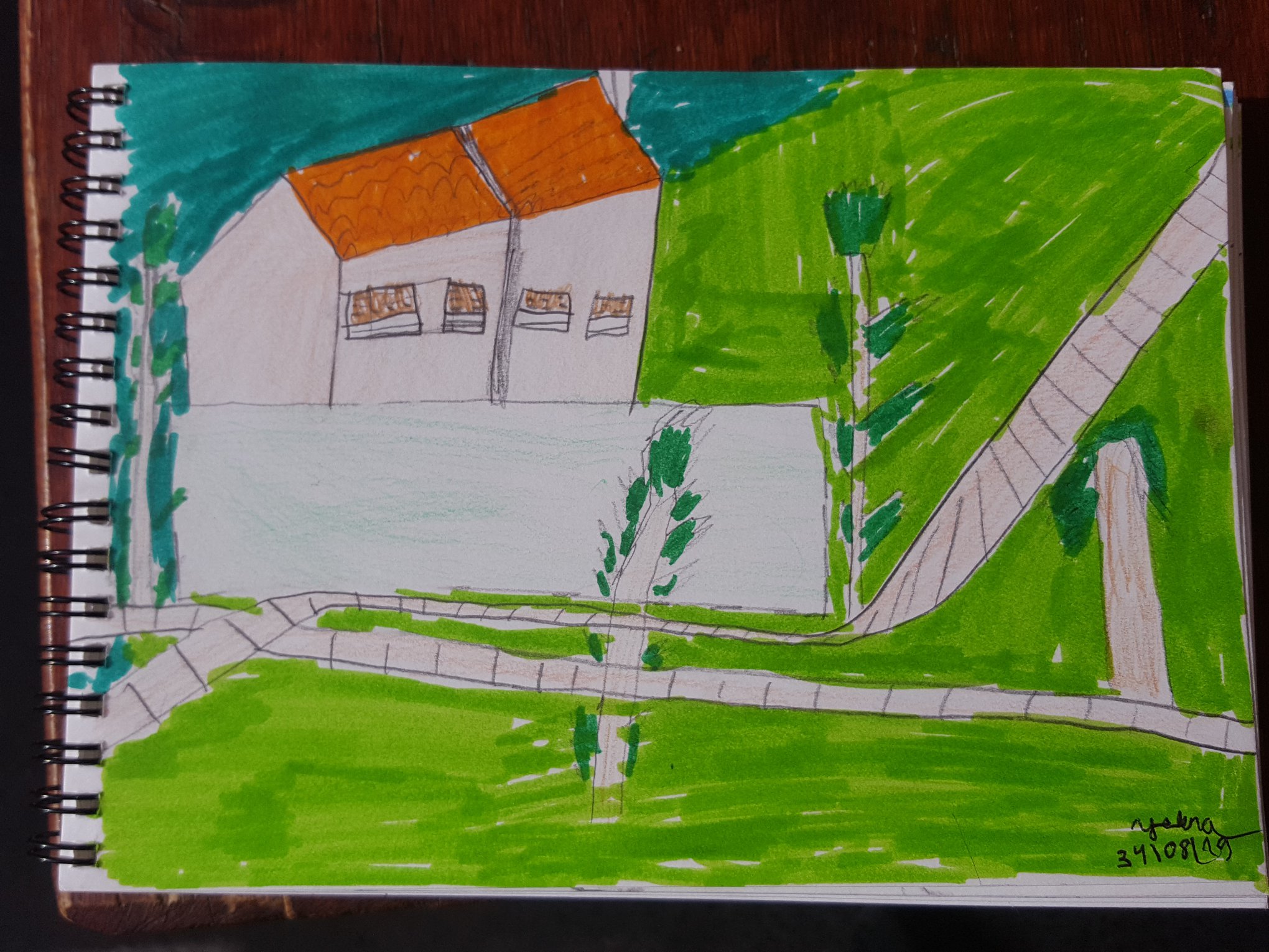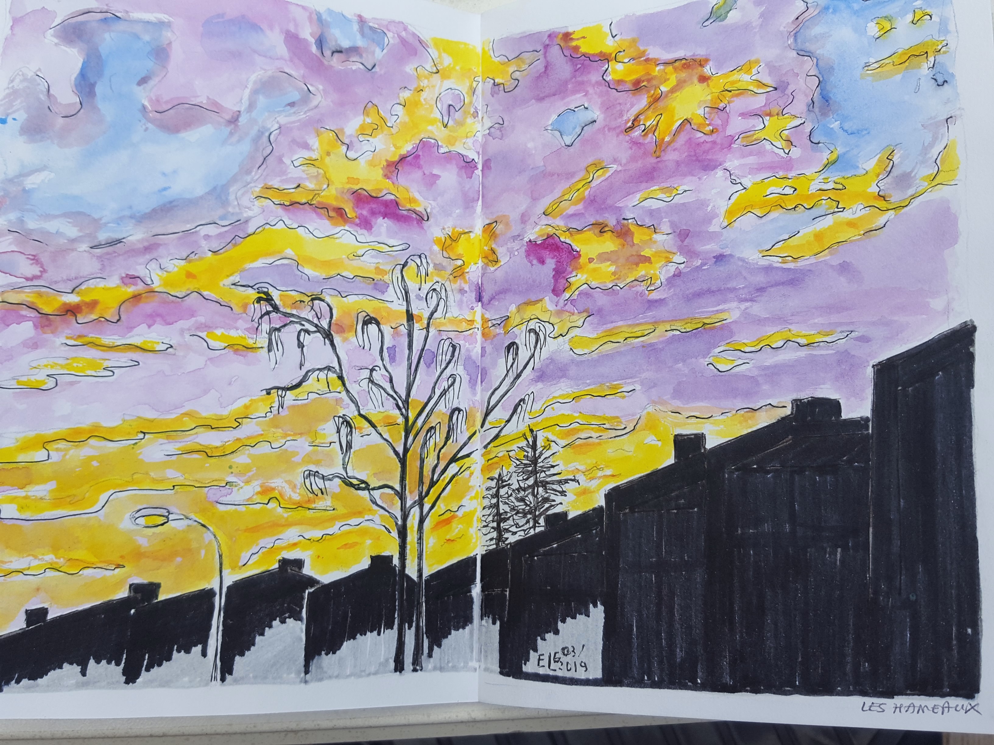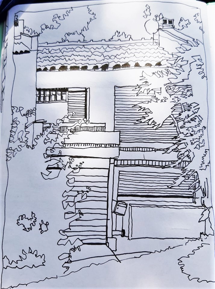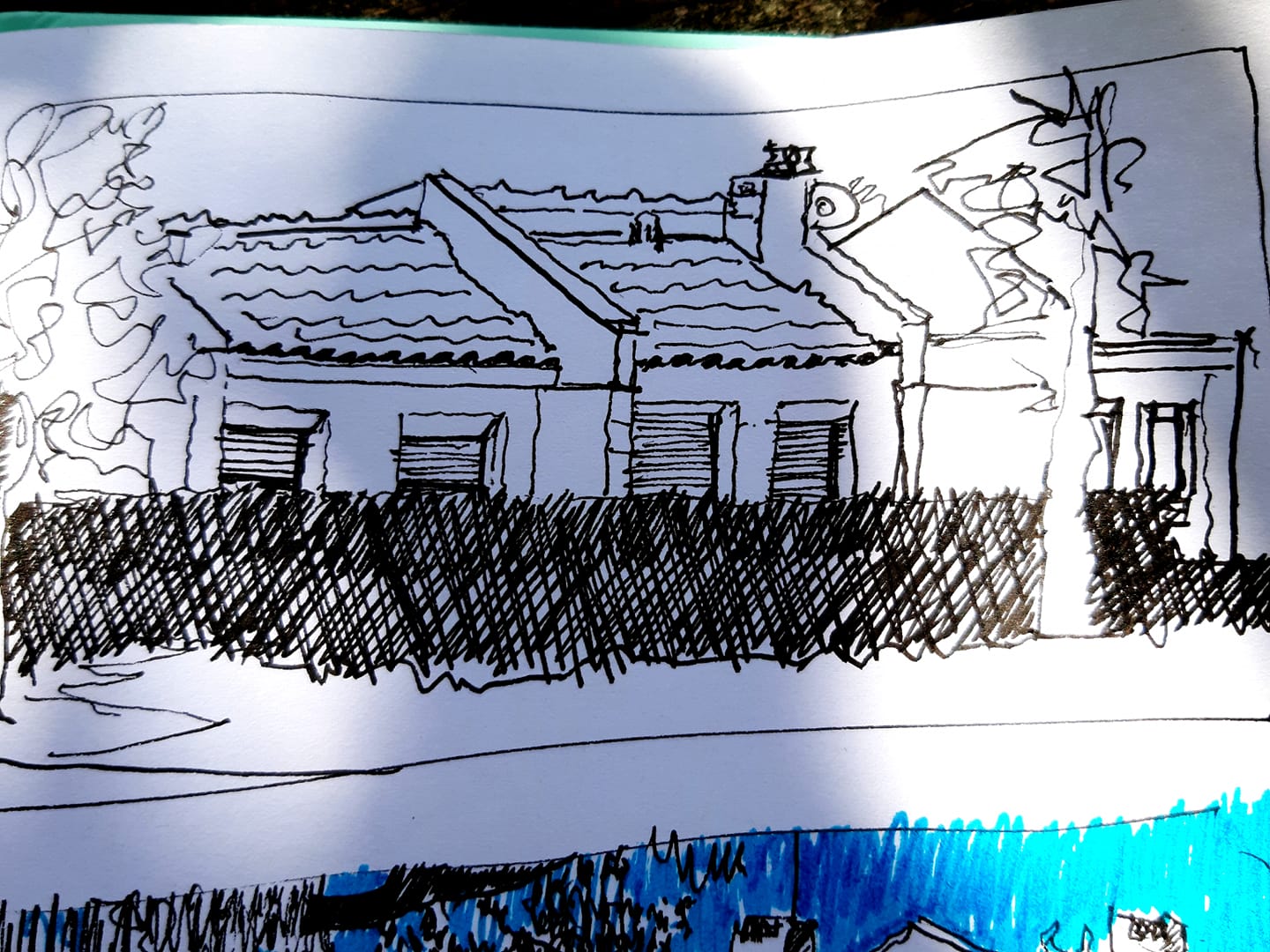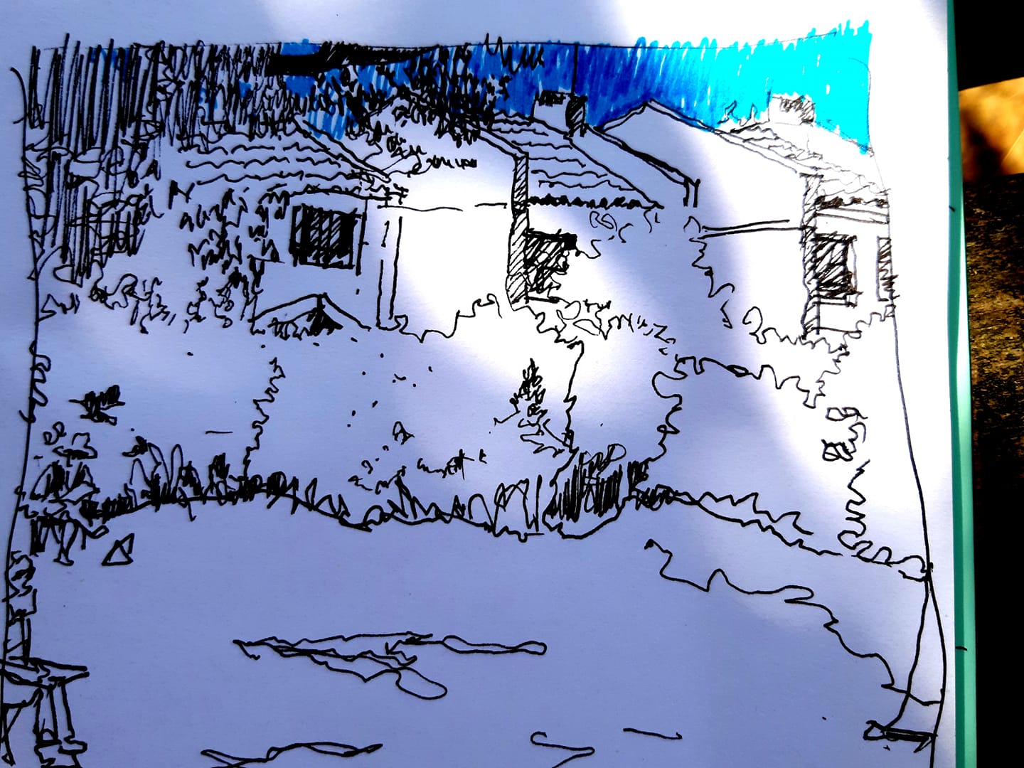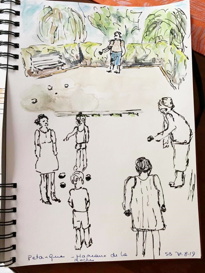 Un temps parfait pour se promener dans la résidence et dessiner. Nous étions une dizaine de dessinateurs, très vite dispersés car la Résidence est grande. Les joueurs de pétanque se sont prêtés à notre besoin de modèles et nous nous nous sommes retrouvés tous autour d’un verre au Bar “Les Hameaux”.