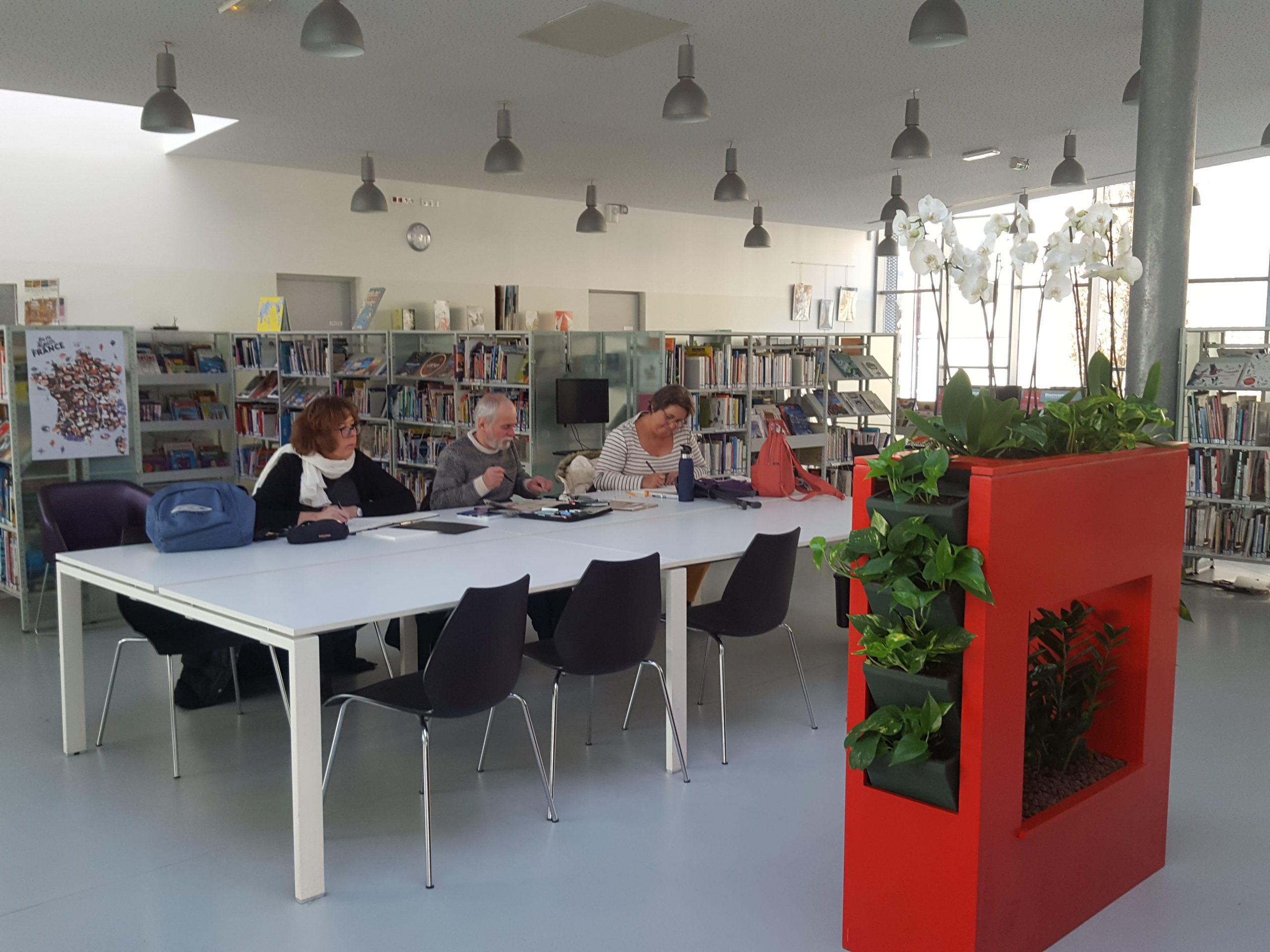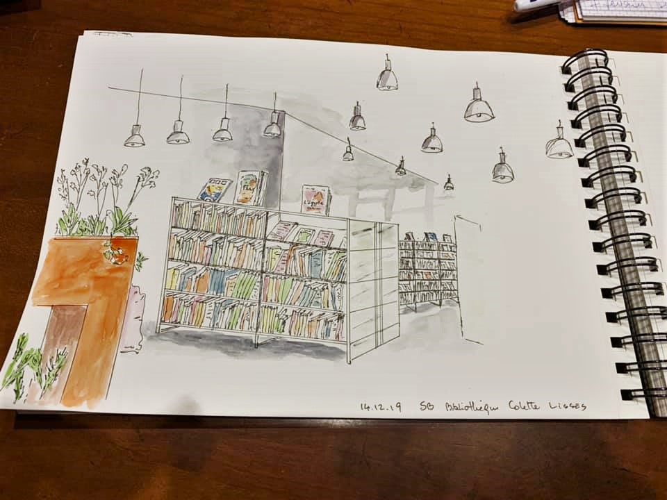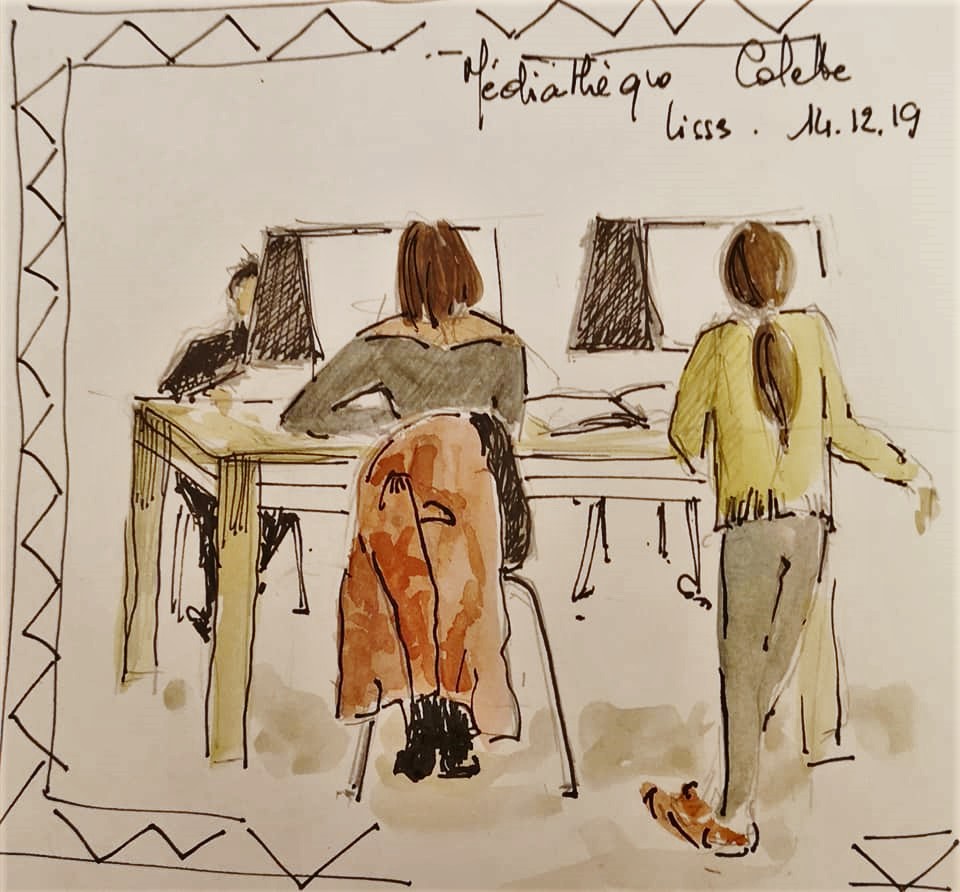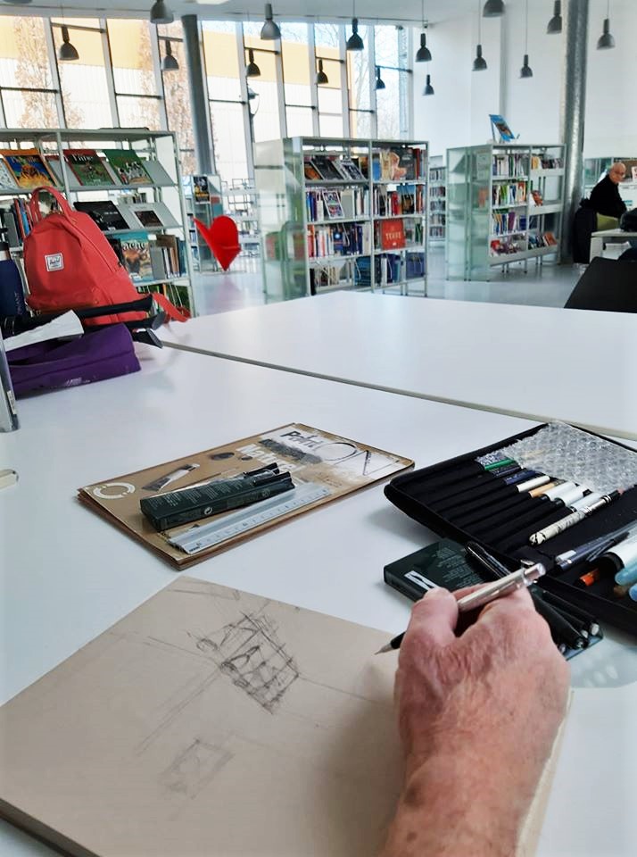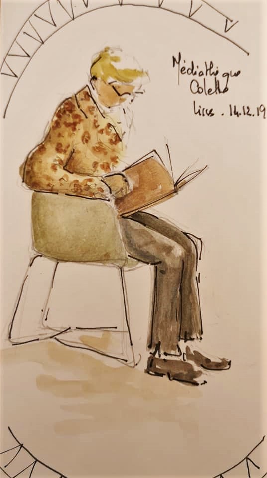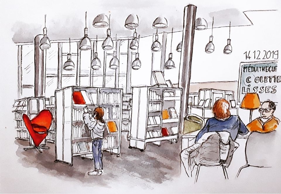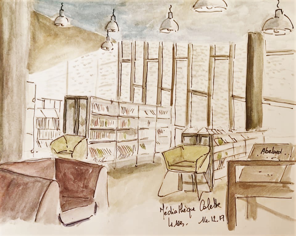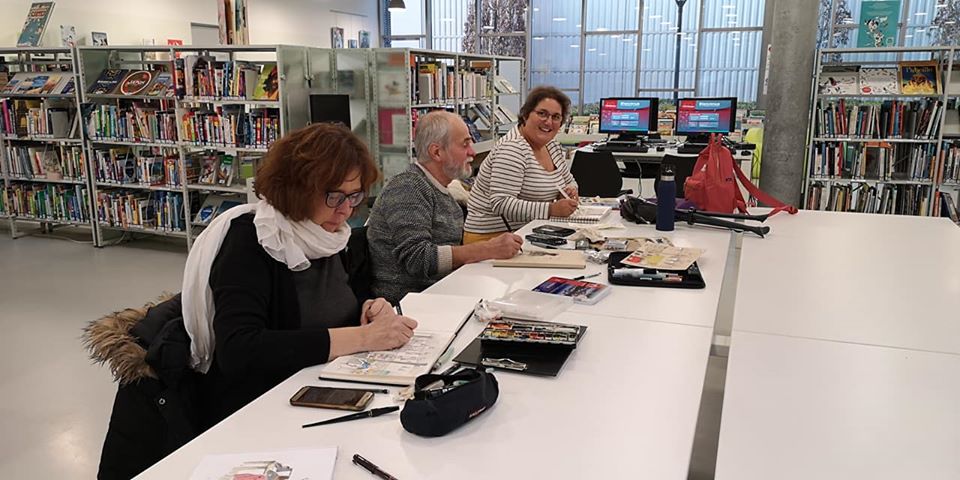 Une journée bien remplies pour l’association Préfigurations ce samedi : Tout d’abord conférence Histoire de l’art de 10h à 12h puis récupérer les livres pour la journée porte ouverte de la bibliothèque « recycle livres » avec le directeur de la Médiathèque Colette, puis accueil des participants à l’après-midi CROQUIS USK de 14h à 17h. La luminosité et l’architecture de la médiathèque ont donné du travail et de jolis croquis.