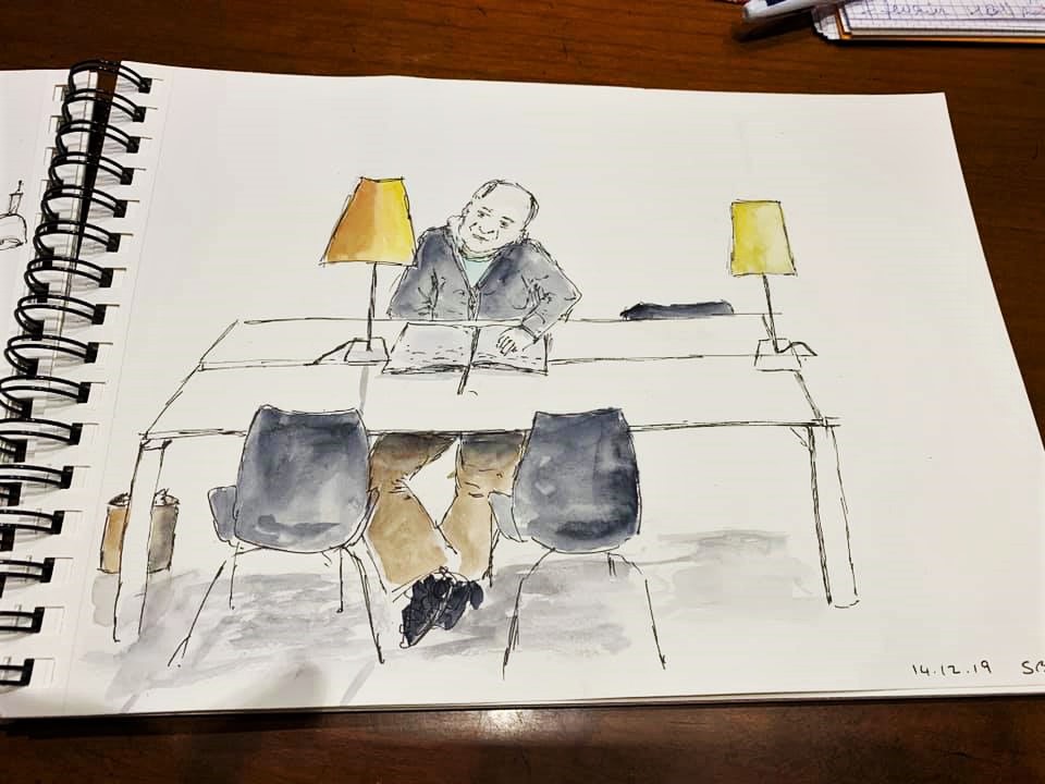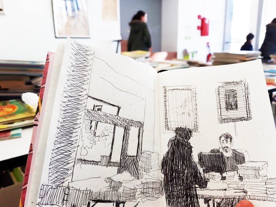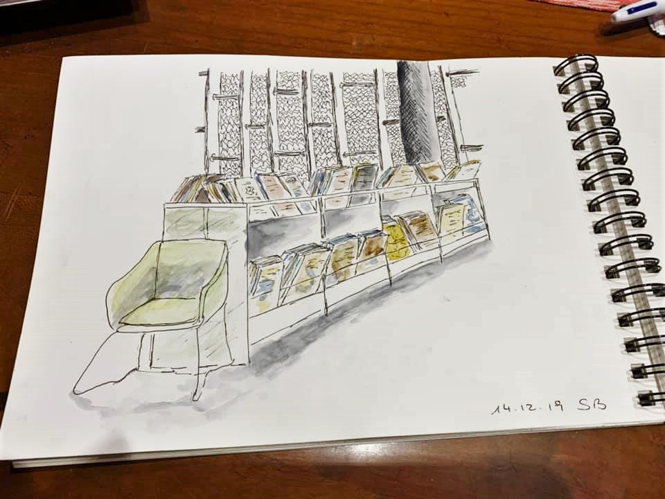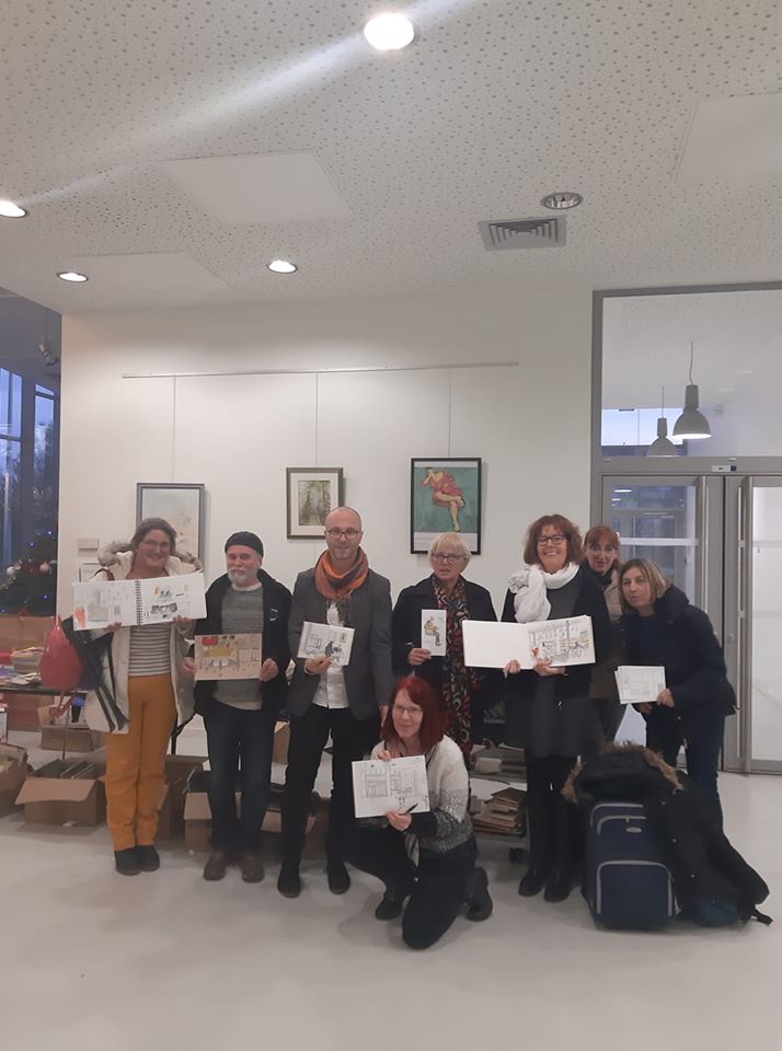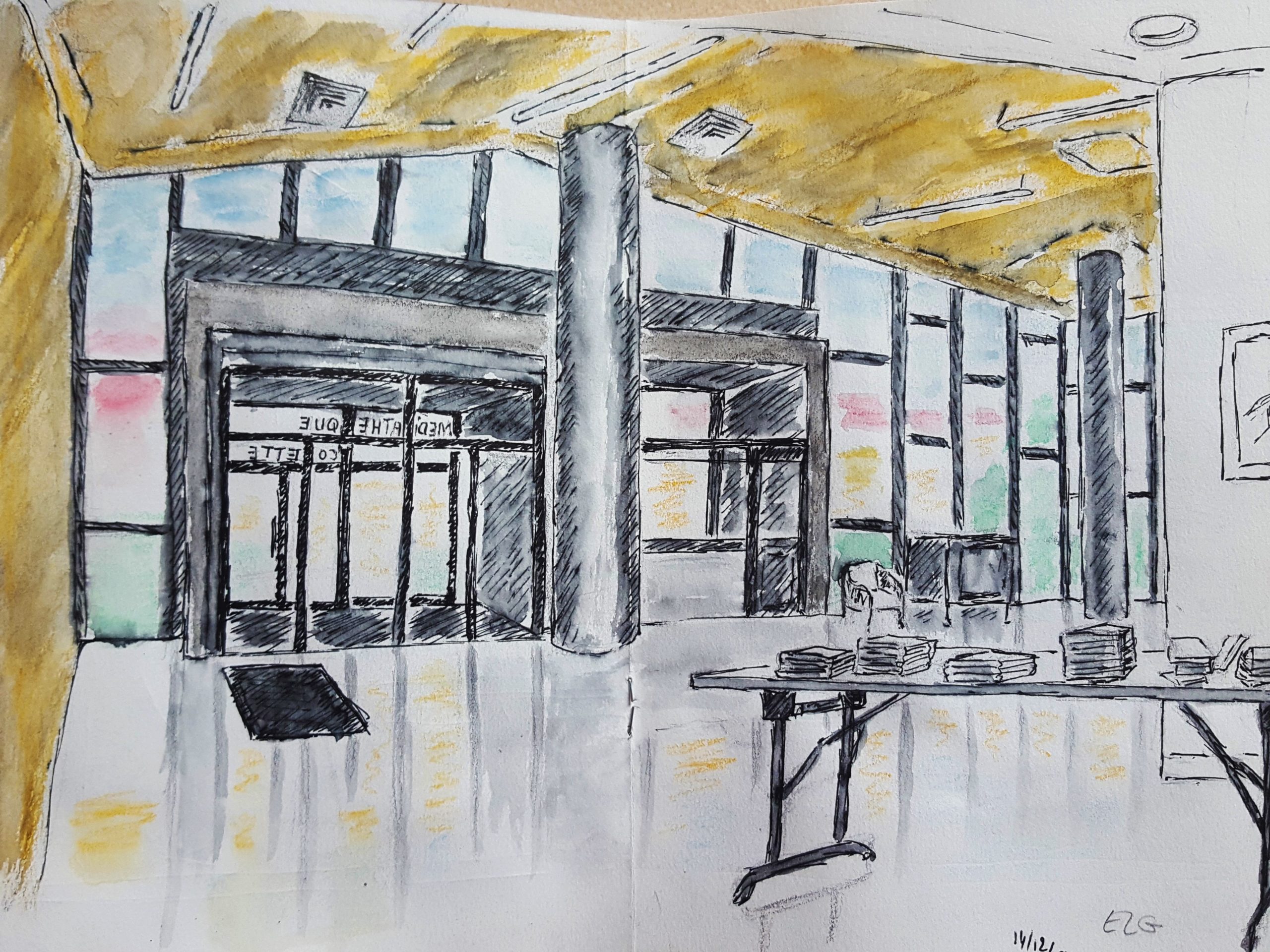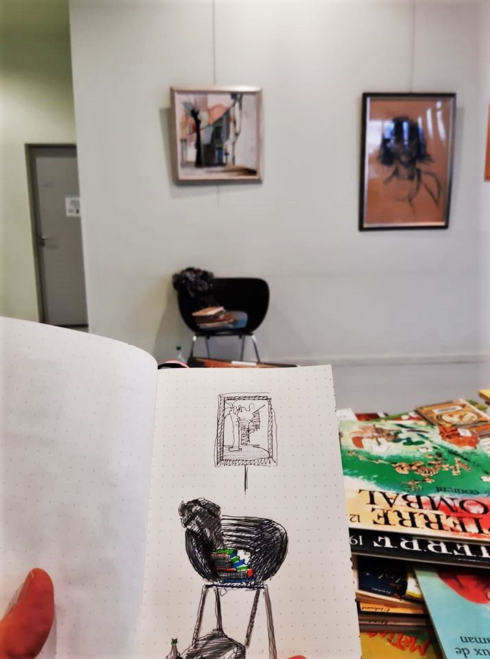 Une journée bien remplies pour l’association Préfigurations ce samedi : Tout d’abord conférence Histoire de l’art de 10h à 12h puis récupérer les livres pour la journée porte ouverte de la bibliothèque « recycle livres » avec le directeur de la Médiathèque Colette, puis accueil des participants à l’après-midi CROQUIS USK de 14h à 17h. La luminosité et l’architecture de la médiathèque ont donné du travail et de jolis croquis.